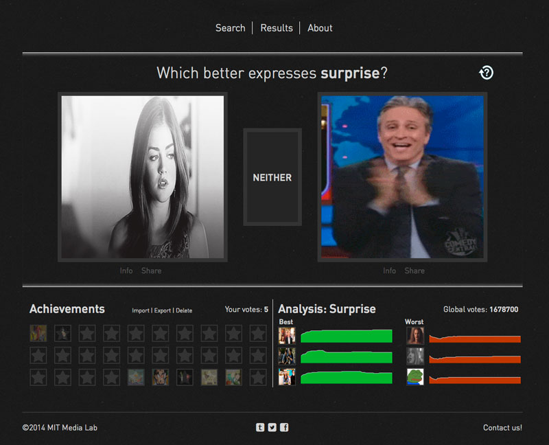 Tolles Projekt: Die beiden MIT-Studenten Travis Rich und Kevin Hu haben eine Website gebaut, mit deren Hilfe sie die visuelle Sprache animierter GIFs besser verstehen möchten. Das Ganze ist für den User wie ein Spiel aufgebaut, bei dem er entscheiden muss, welches GIF besser zu einer von 17 Schlüsselemotionen passt (Angst, Überraschung, Freude, Ekel usw.). Abgesehen davon, dass es ein netter Zeitvertreib ist, helft ihr bei einem interessanten Wissenschaftsprojekt mit, während ihr da rumklickt. Ein klassisches Win-Win. Zu ihrer Motivation für dieses Projekt schreiben die beiden: